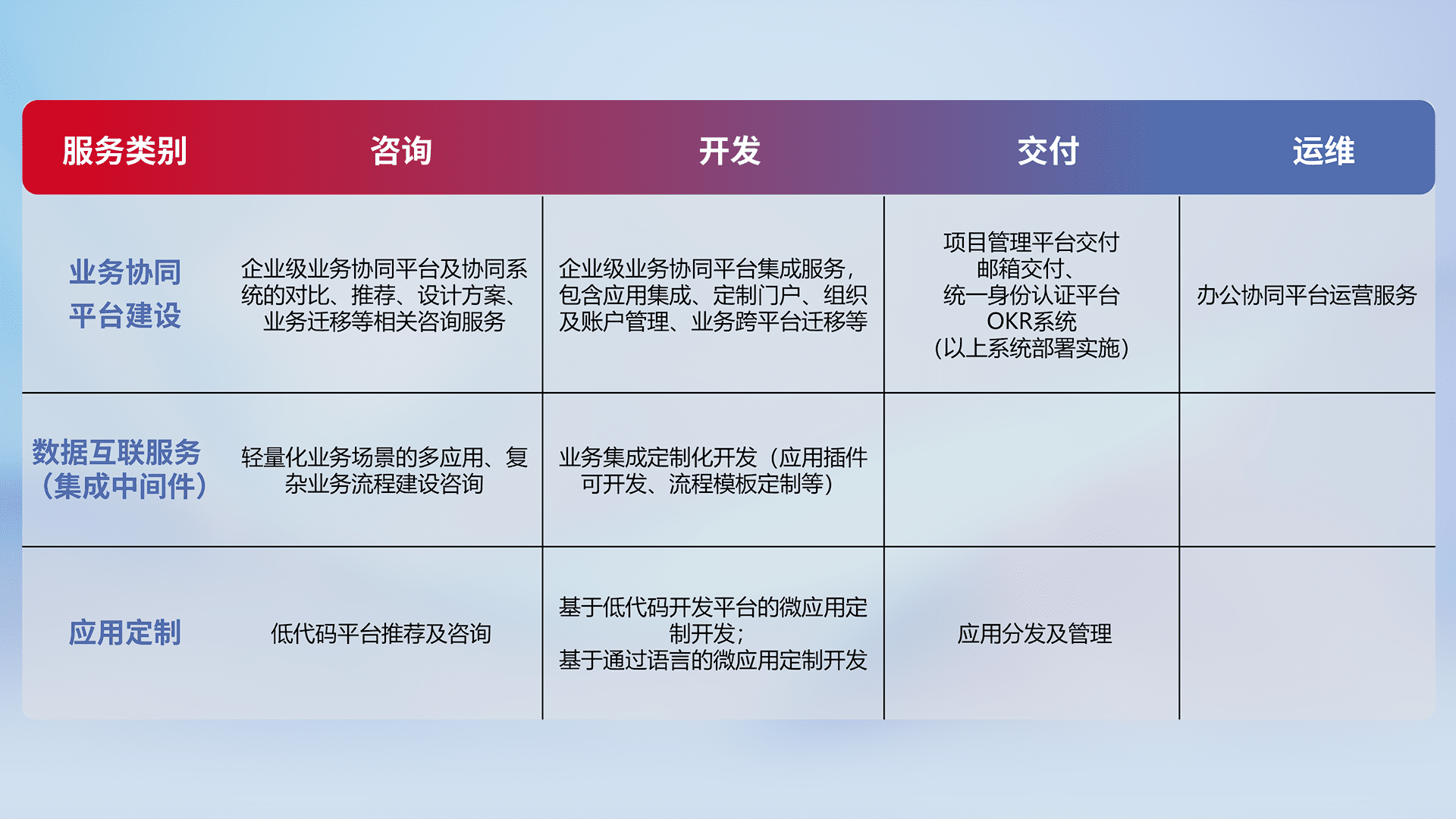 针对钉钉、、、企微、、、、IDaas等平台级产品提供产品的规划、、、、方案、、、交付、、、定制化开发等服务,,,,实现如统一协同办公、、智能客户服务、、混合会议管理、、、智能数据查询、、等业务场景,,,,实现数字化转型。。